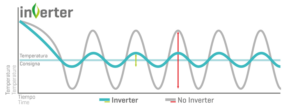 However, with INVERTER technology, once the compressor starts operating, it varies its speed to adapt to the temperature differential that exists at any given time, avoiding the compressor starting and stopping, which increases consumption and causes the temperature of the equipment to fluctuate more.