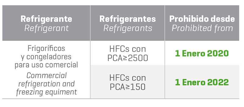 F-Gas classifies hydrofluorcarbons according to their global warming potential. Therefore, for each application there are different limits and different ban dates. These data are reflected in the following table:
