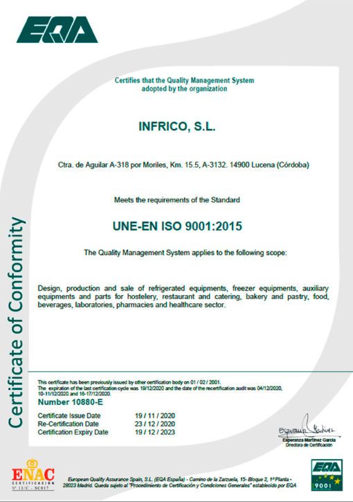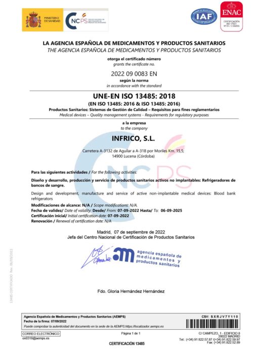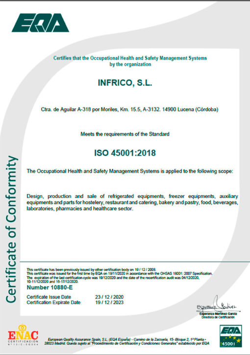 Infrico Medcare carries out its work with the maximum guarantees and safety; to this end, it has implemented an occupational risk prevention system based on the OSHAS 45001:2018 regulation, maintaining an integrated management system: quality-environment-prevention.